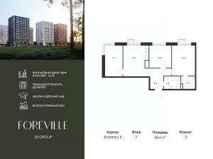 Предчистовая отделка в подарок! Пешая доступность от метро и московская прописка! Продается уютная 3-комн. квартира площадью 65,6 кв.м на 7 этаже 17 этажного жилого комплекса бизнес-класса Foreville от 3S Group.