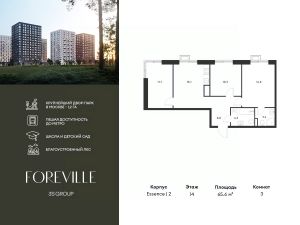 Предчистовая отделка в подарок! Пешая доступность от метро и московская прописка! Продается уютная 3-комн. квартира площадью 65,6 кв.м на 14 этаже 17 этажного жилого комплекса бизнес-класса Foreville от 3S Group.