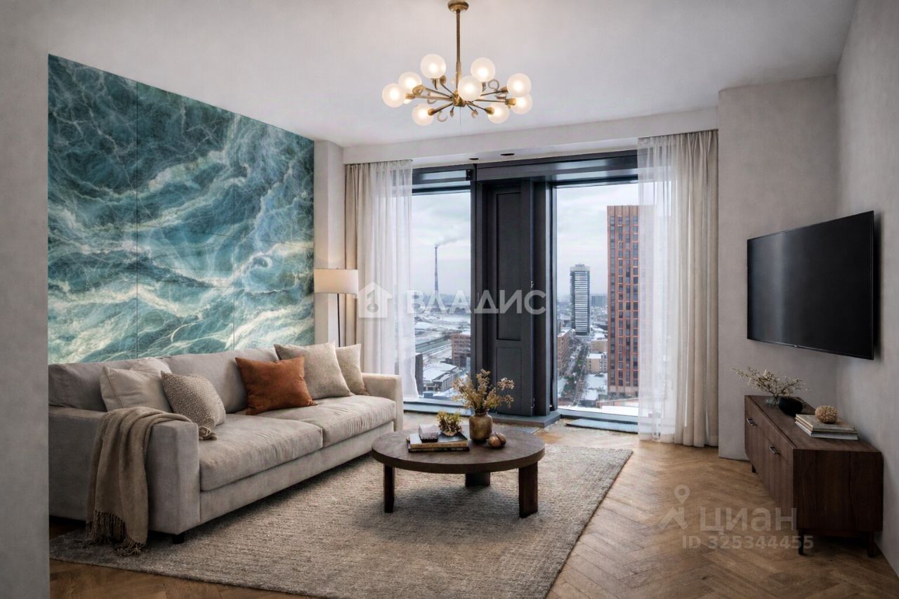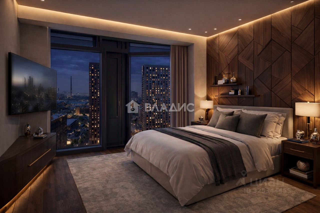 Видовая квартира на 19 этаже в современном доме премиум класса. Проект представляет собой 58-этажный небоскреб, выполненный в футурестическом стиле. Многофункциональное стекло, используемое на фасадах, сочетает в себе солнцезащитные и энергосберегающие свойства.