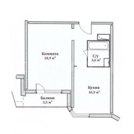 Планировка, включает в себя: жилую комнату -18,9 м² с выходом на застекленный балкон, а также просторную кухню -10,9 м². Имеется вся необходимая встроенная мебель и кухонный гарнитур.