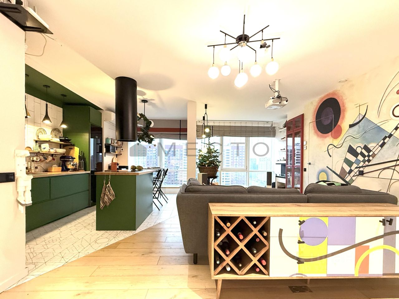 Просторная кухня с островом, оснащена 2-мя вытяжками (направленной и общей), столом у окна с панорамным видом. В гостиной напротив дивана установлен экран для просмотра кино всем вместе. В углу биокамин для уютных вечеров. Удобное зонирование позволяет членам семьи отдыхать вместе, не мешая друг другу.