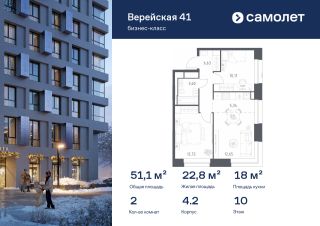 Строим кварталы для жизни с заботой о будущем. Предлагается 2-комнатная квартира бизнес-класса 51,05 кв.м в корпусе 4.2 на 10 этаже, в "Верейская 41"