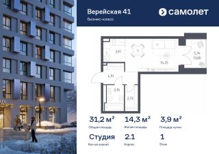 Строим кварталы для жизни с заботой о будущем. Предлагается квартира студия бизнес-класса 31,16 кв.м в корпусе 2.1 на 1 этаже, в "Верейская 41"