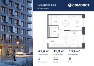 Строим кварталы для жизни с заботой о будущем. Предлагается 1-комнатная квартира бизнес-класса 41,36 кв.м в корпусе 2.1 на 6 этаже, в "Верейская 41"