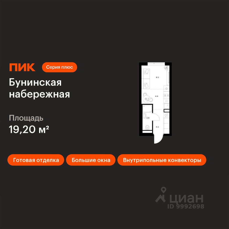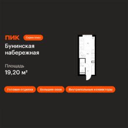 Продаётся квартира-студия площадью 19,2 кв.м на 8 этаже 16 этажного дома (Корпус 2.6/1.4, Секция 4) проекта ПИК Бунинская набережная. Светлый просторный подъезд на уровне земли, функциональная планировка, большие окна, c отделкой.