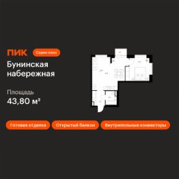 Продаётся 1-комн. квартира площадью 43,8 кв.м на 5 этаже 16 этажного дома (Корпус 2.6/1.1, Секция 1) проекта ПИК Бунинская набережная. Светлый просторный подъезд на уровне земли, функциональная планировка, большие окна, c отделкой.
