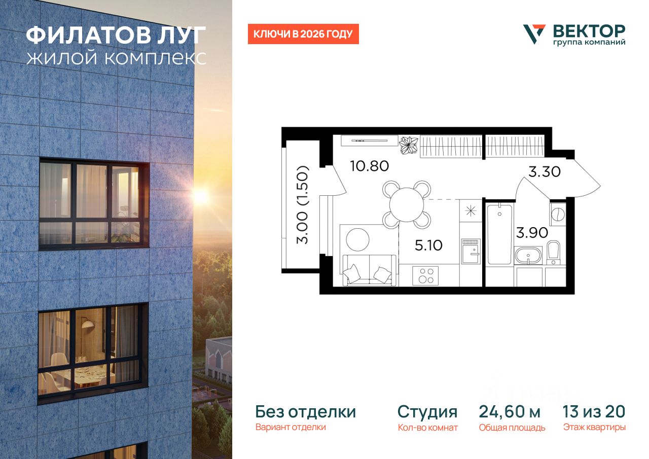 Продается квартира-студия площадью 24,6 кв.м на 13 этаже 20 этажного дома в ЖК "Филатов Луг" от федерального девелопера ГК "Вектор".