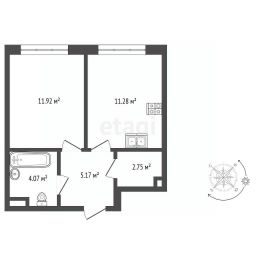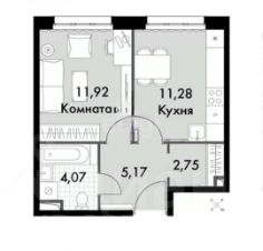В апартаментах большая кухня площадью 11,28 кв мета, спальня 12 метров и отдельная гардеробная - 2,75 кв метра, а также ванная комната с установленной полноразмерной ванной