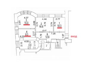 • Три комнаты: 15 м², 9.3 м² и 10.3 м² (смотреть план).