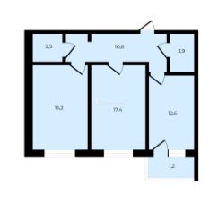 Общая площадь 64,4 кв.м., комнаты - 16,2 и 17,4 кв.м, просторная кухня - 12,6 кв.м.