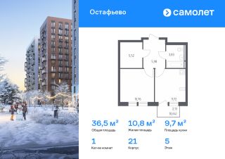 Строим кварталы для жизни с заботой о будущем. Предлагается 1-комнатная квартира комфорт-класса 36,45 кв.м в корпусе 21 на 5 этаже, в ЖК "Остафьево"