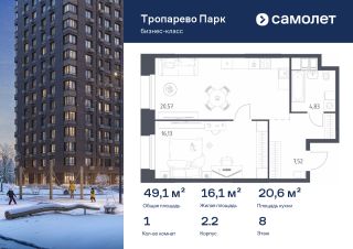 Строим кварталы для жизни с заботой о будущем. Предлагаются 1-комнатные апартаменты бизнес-класса 49,05 кв.м в корпусе 2.2 на 8 этаже, в МФК "Тропарево Парк"