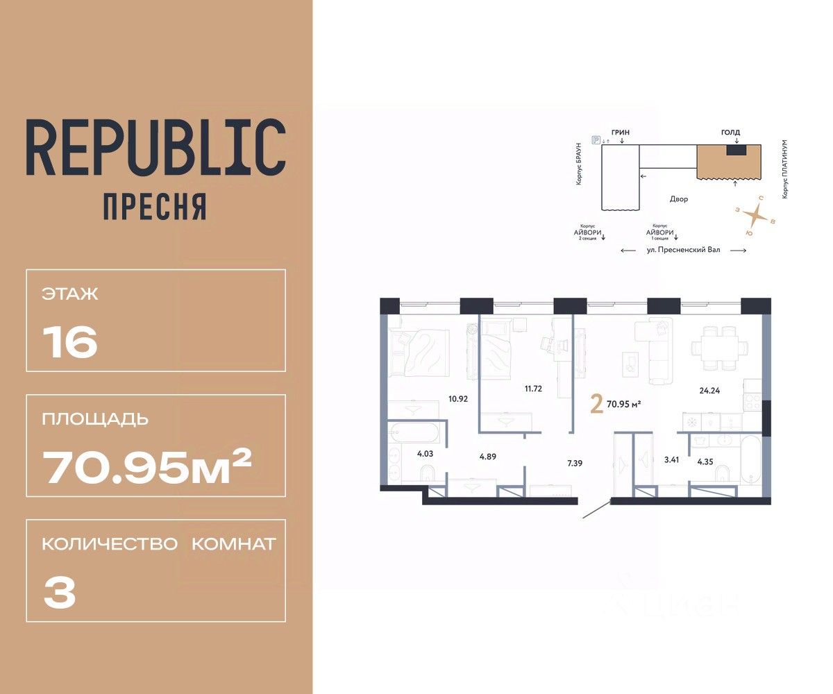 Продается 3комнатная квартира на 16 этаже от застройщика Страна Девелопмент. Площадь квартиры 70.95 кв. м.