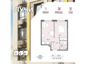 Продается 1-комнатная квартира общей площадью 34 кв. метров на 12 этаже жилого комплекса Лучи.