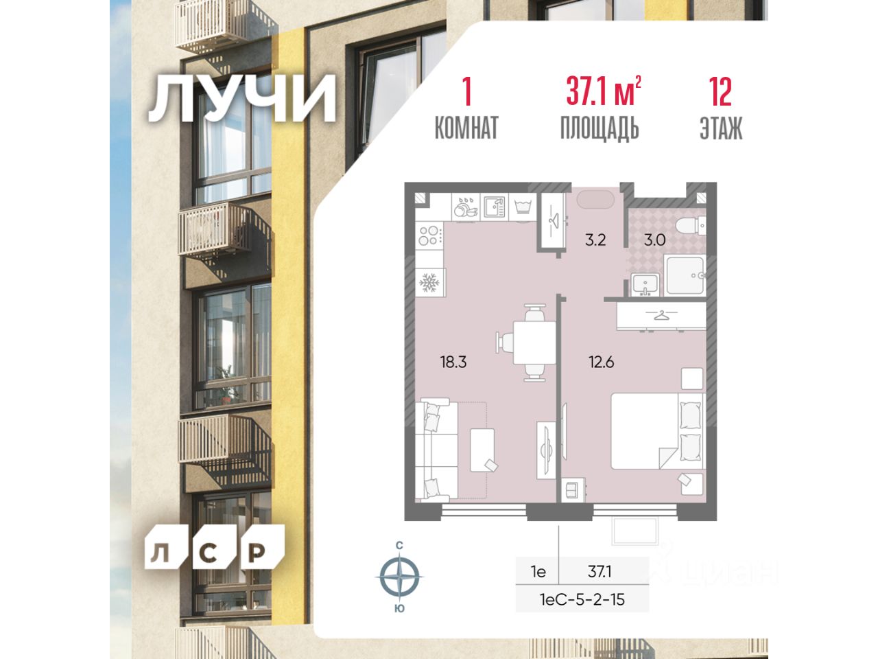 Продается 1-комнатная квартира общей площадью 37.1 кв. метров на 12 этаже жилого комплекса Лучи.
