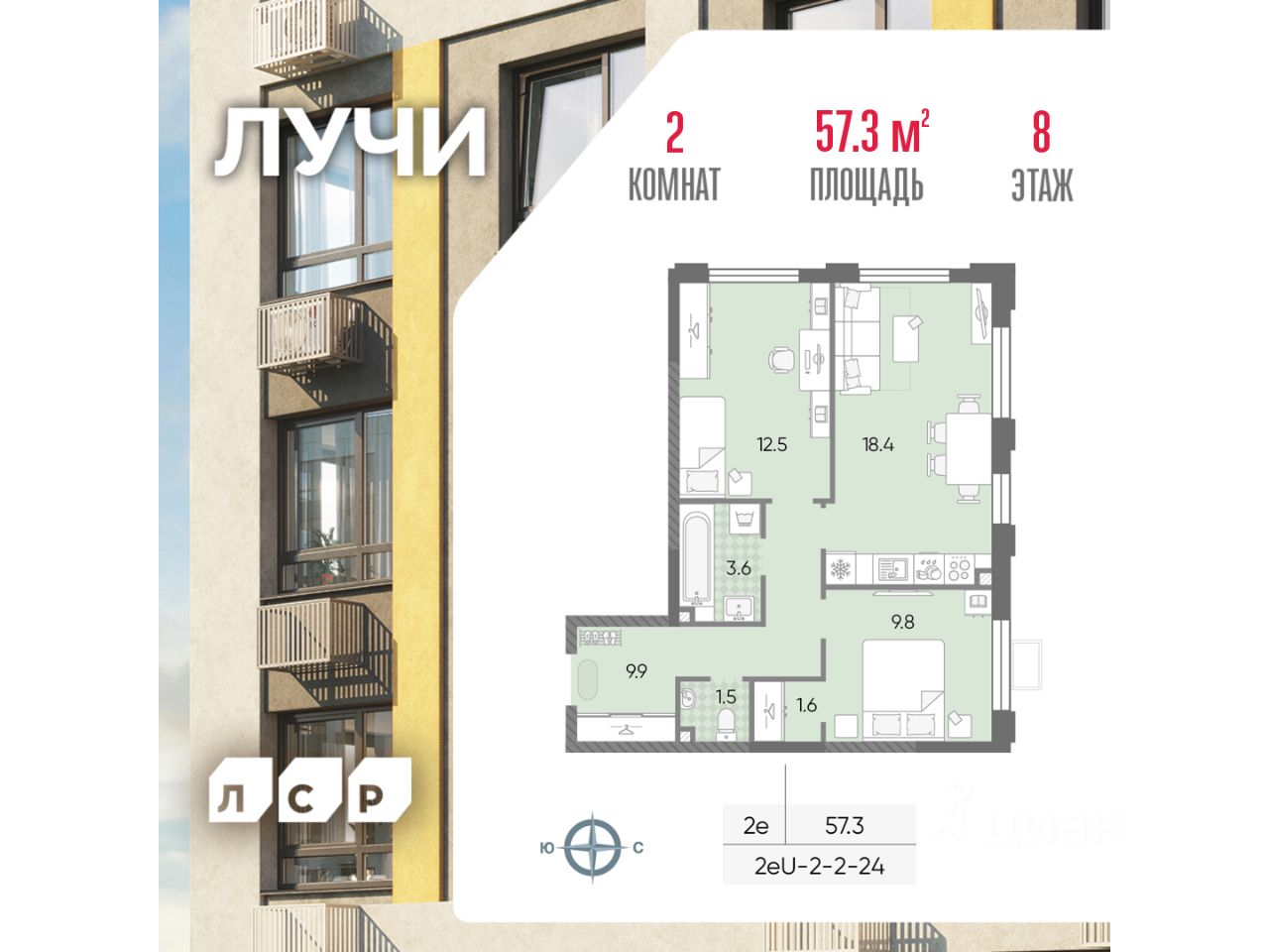 Продается 2-комнатная квартира общей площадью 57.3 кв. метров на 8 этаже жилого комплекса Лучи.
