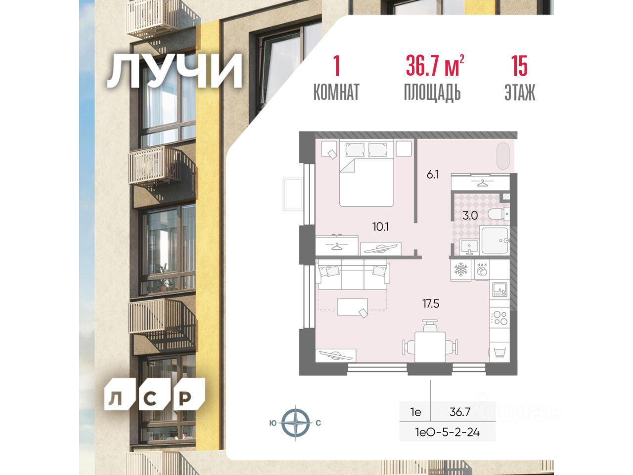 Продается 1-комнатная квартира общей площадью 36.7 кв. метров на 15 этаже жилого комплекса Лучи.