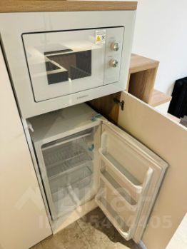 В студии выполнен стильный ремонт — стены выкрашены в светлые тона, на полу постелен ламинат, есть вся необходимая мебель и бытовая техника, в холле встроена система хранения.