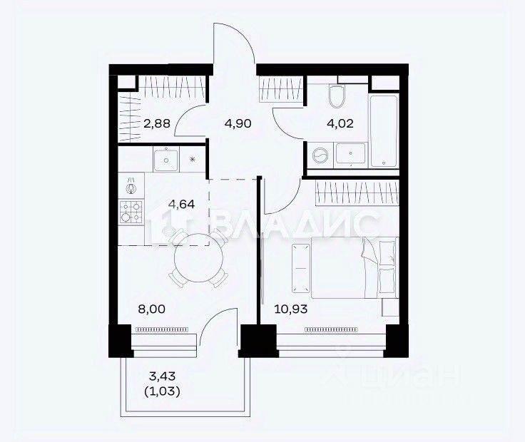 Эргономичная планировка: кухня-гостиная, спальня, совмещенный санузел, гардеробная, балкон.