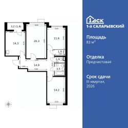 Продаётся 3-к квартира номер 5 общей площадью 83.7 кв.м. на 3-м этаже 9 этажного здания. Отделка Whitebox. Цена с учётом скидки.