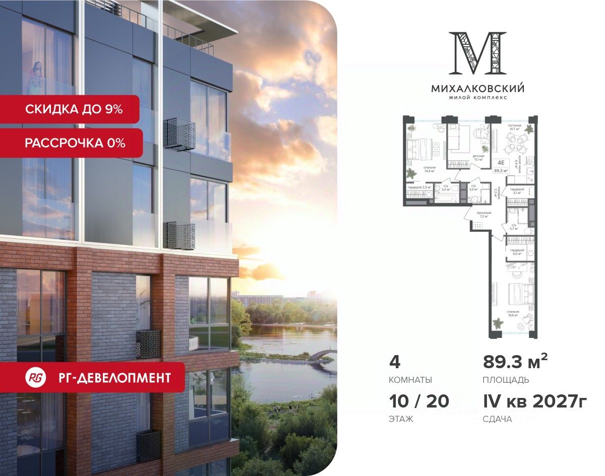 Продаётся 4-к квартира 89,3 кв.м. в ЖК "Михалковский" на 10-м этаже 20 этажного дома.