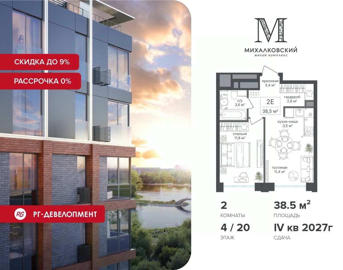 Продаётся 2-к квартира 38,5 кв.м. в ЖК "Михалковский" на 4-м этаже 20 этажного дома.