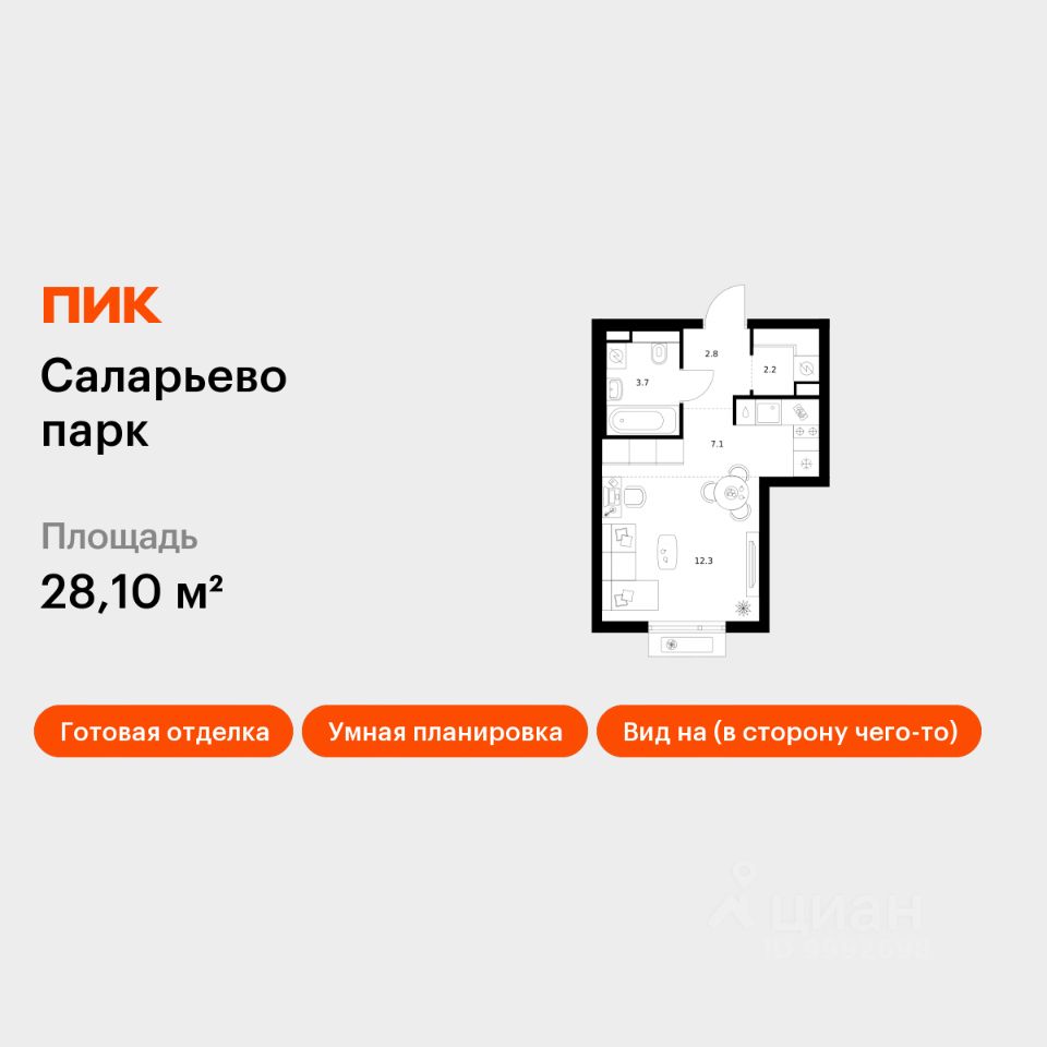 Продаётся квартира-студия площадью 28,1 кв.м на 11 этаже 14 этажного дома (Корпус 69.7, Секция 7) проекта ПИК Саларьево парк. Светлый просторный подъезд на уровне земли, функциональная планировка, большие окна, c отделкой.