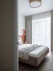 Кухня-гостиная, спальня со своей гардеробной, с/у с ванной и зоной прачечной.
