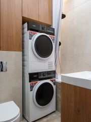 Совмещённый санузел оборудован ванной, стиральной и сушильной машиной.