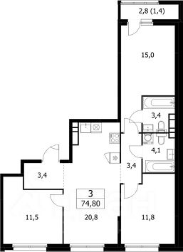 Общая площадь 74,8 кв.м., квартира с отделкой вайт бокс.