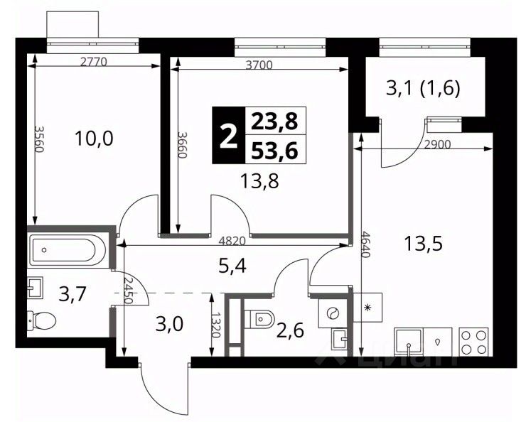 Общая площадь 53,6 кв.м., квартира с отделкой вайт бокс.
