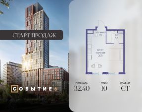 Продаётся квартира-студия от застройщика: общая площадь 32.40 м², жилая 20.80 м², кухня 5.00 м², 10-й этаж, жилой квартал "Событие-6", корпус 2 (секция 4) Срок сдачи: 1 квартал 2029 года.