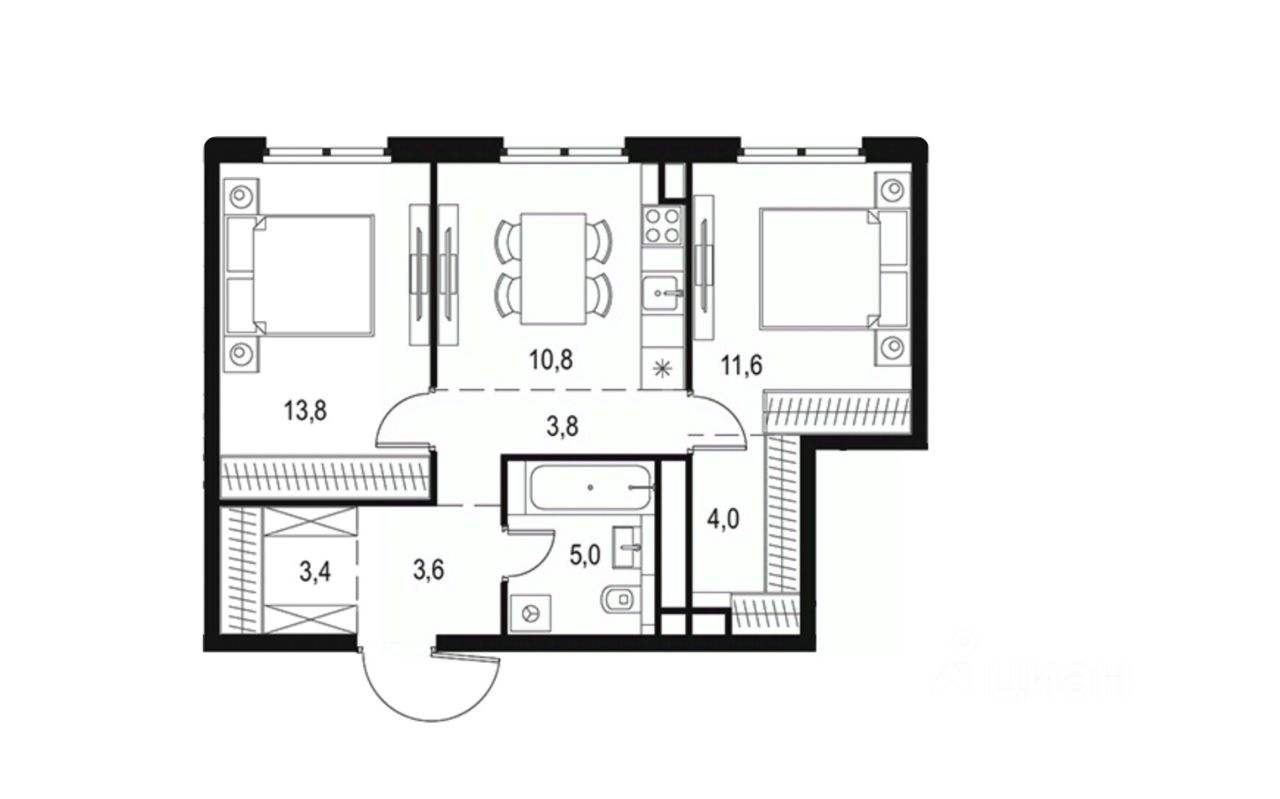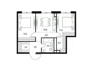Планировка состоит из двух изолированных комнат, прихожей, совмещенный санузел и кухня-гостиная, есть возможность сделать второй санузел вместо гардеробной.