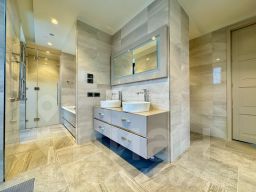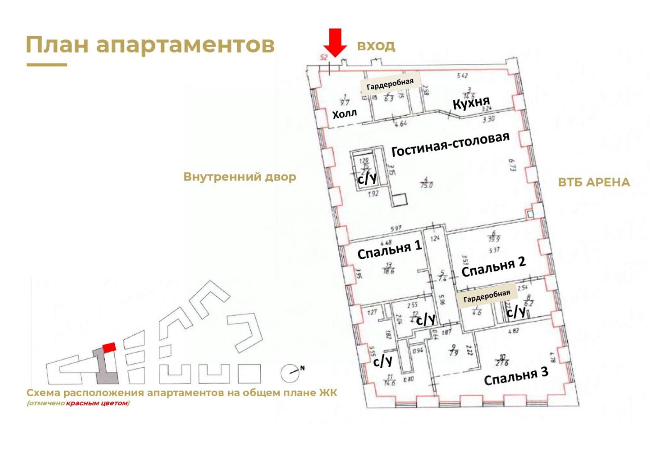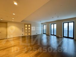 В апартаментах 3 спальни 28, 20, 19 м.кв., кухня-15м.кв. гостиная-столовая 75 м.кв. 4 санузла, 2 гардеробные комнаты, постирочная комната, техническое помещение. Высота потолков -3.15 м. Новый современный ремонт с применением качественных материалов. Стены- нейтральный цвет, пол- паркетная доска. Панорамные окна с видом на парк, внутренний двор и ВТБ-Арена. Санузлы оборудованы современной сантехникой и мебелью. Кухня со встроенной мебелью и бытовой техникой ведущих мировых брендов. Последний 10 этаж дает возможность поставить отдельную вентиляцию (вывести на крышу).