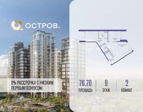 Продаётся двухкомнатная квартира от застройщика: общая площадь 76.70 м², жилая 29.90 м², кухня 30.50 м², 9, жилой квартал "Остров 12", корпус 1 (12.1 квартал) (секция 1). срок сдачи: 4-кв. 2025.