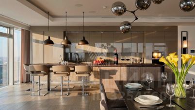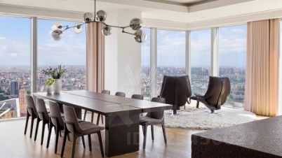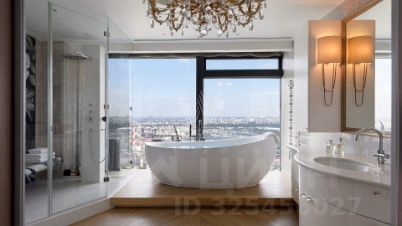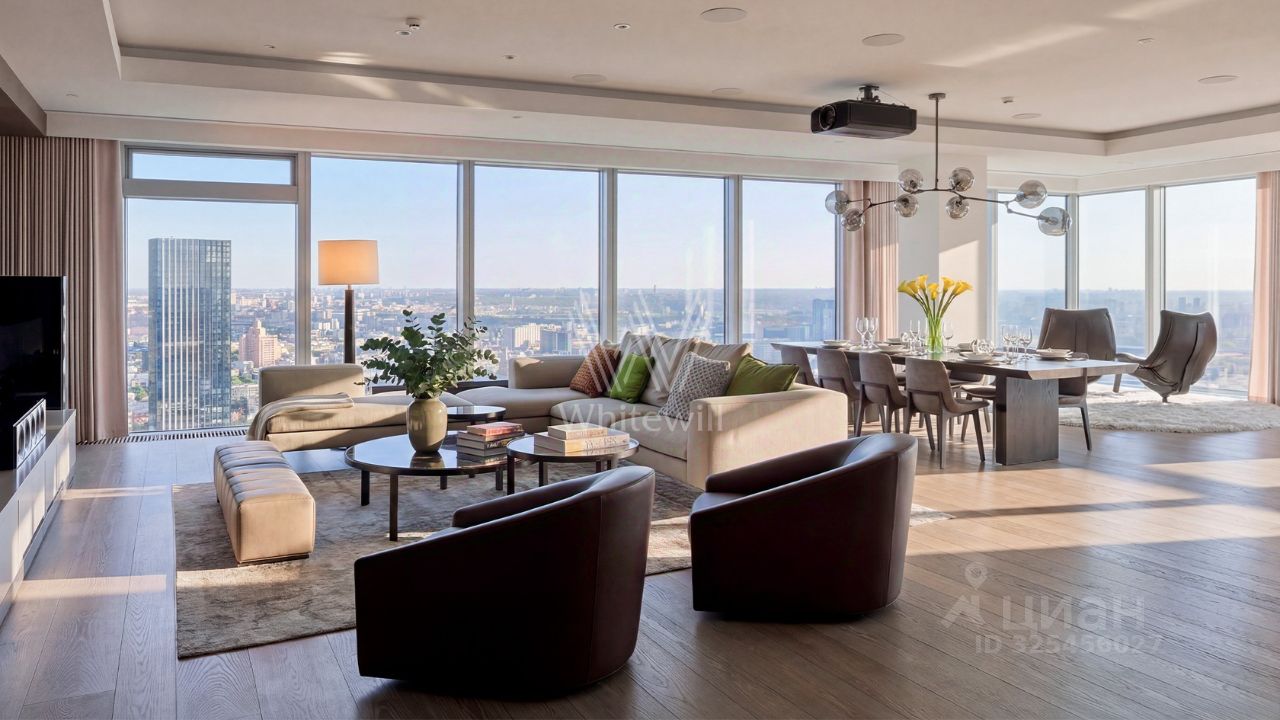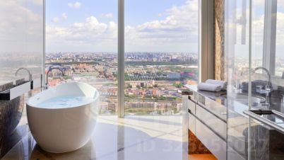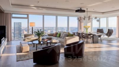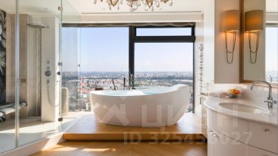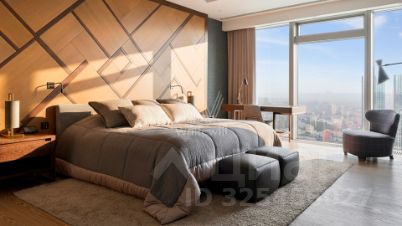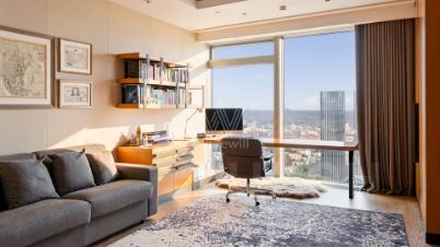 Видовые представительские апартаменты с тремя спальнями общей площадью 320 м² в комплексе небоскрёбов премиум-класса "Город Столиц". Апартаменты с интерьером в современным стиле расположены в башне "Москва" на шестьдесят шестом этаже. В отделке использованы натуральные материалы — мрамор, полы выполнены из натурального баварского дуба, отделка стен кожей и шерстяной эксклюзивной тканью. Интерьеры укомплектованы мебелью от известных европейских брендов и авторскими светильниками. Угловое панорамное остекление наполняет пространство светом и открывает завораживающие виды на Кремль, Храм Христа Спасителя, Хамовники, Лужники и реку.