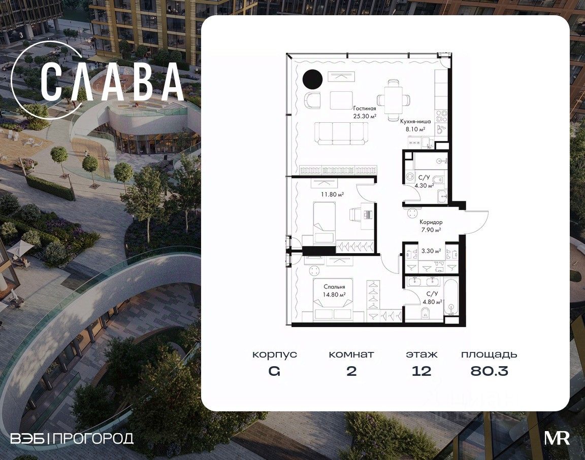 В продаже 2-комнатная квартира площадью 80.30 м² на 12-м этаже корпуса G.