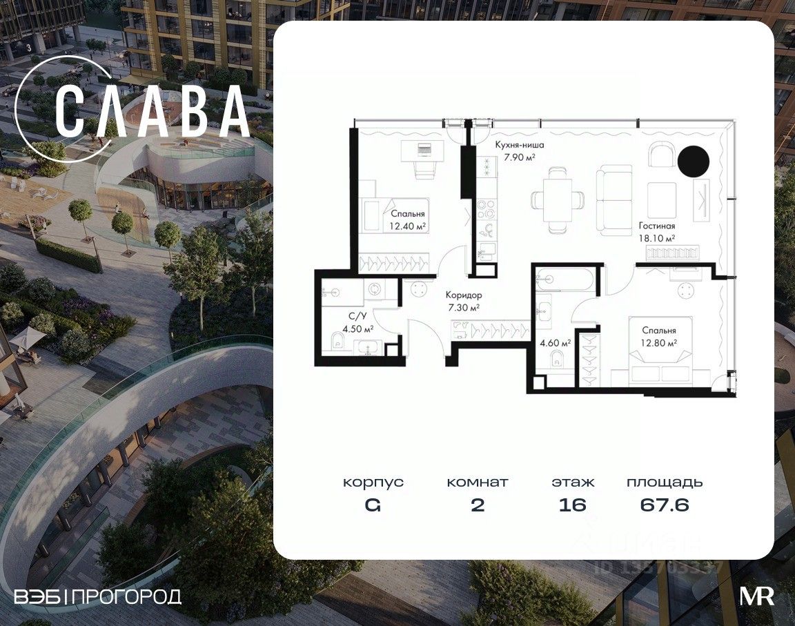 В продаже 2-комнатная квартира площадью 67.60 м² на 16-м этаже корпуса G.