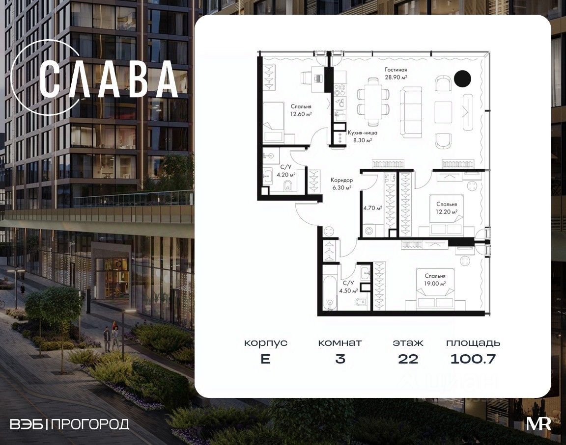 В продаже 3-комнатная квартира площадью 100.70 м² на 22-м этаже корпуса E.
