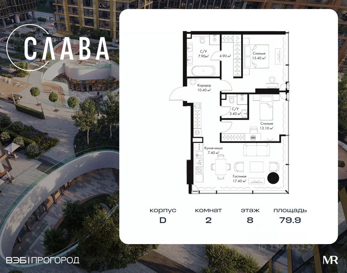 В продаже 2-комнатная квартира площадью 79.90 м² на 8-м этаже корпуса D.