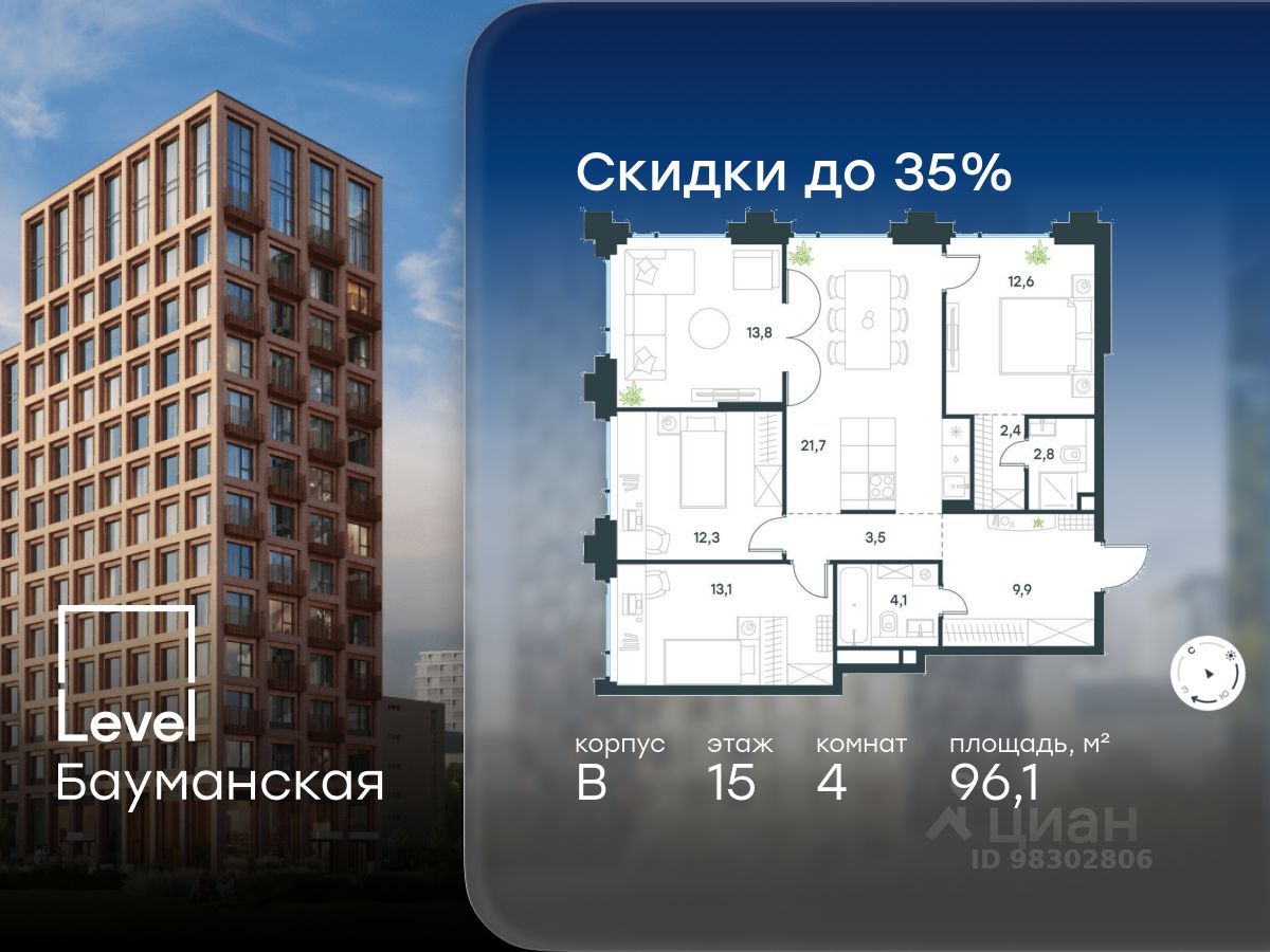 В Басманном районе (ЦАО) продается 4-комнатная квартира площадью 96.10 кв.м без отделки. Квартира расположена на 15 этаже 17-этажного корпуса " B" в жилом комплексе бизнес-класса Level Бауманская (компания Level Group).