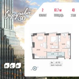Продается 2-комн. кв-ра площадью 61.70 кв.м на 43 этаже 45 этажного монолитного дома в ЖК "ОБРУЧЕВА 30" от Группа ЛСР. "Обручева 30" - дом бизнес-класса в престижном районе ЮЗАО и шаговой доступности от станции метро "Калужская". Два корпуса неповторимой формы от архитекторного бюро "Камень" с уникальными форматами квартир: от двухуровневых с камином до квартир с террасой. "Клубная" инфраструктура для резидентов: студии йоги и сайкла, тренажерные залы, коворкинг-зона, конференц-залы, кинозал и детские игровые комнаты.
