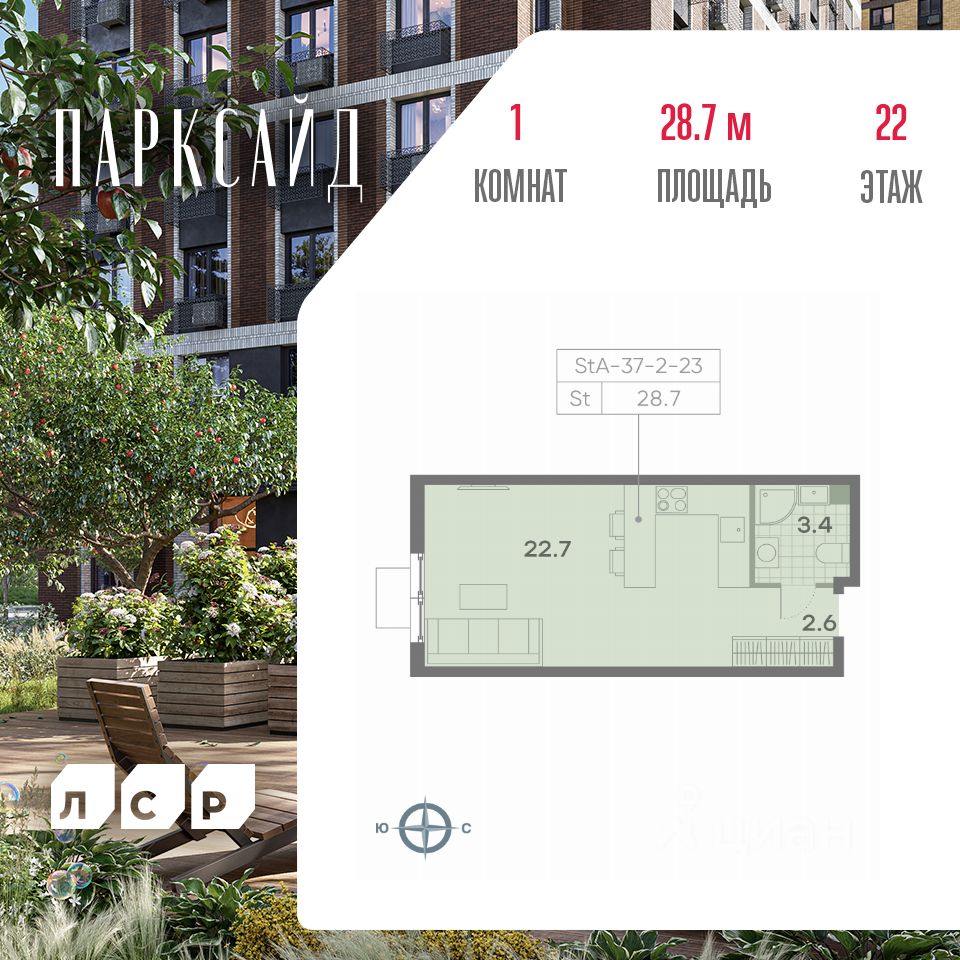 Продается квартира студия площадью 28.80 кв.м на 22 этаже 23 этажного монолитного дома в ЖК "ПАРКСАЙД" от Группа ЛСР. "Парксайд" это гармония природы и города. Жилой комплекс бизнес-класса строится в районе Чертаново Центральное Южного административного округа Москвы. В непосредственной близости от Битцевского леса, одного из крупнейших лесных массивов Москвы.