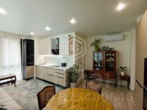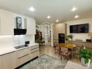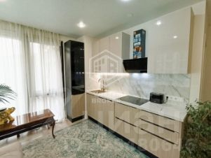 Сердце квартиры просторная кухня-гостиная, где гармонично сочетаются функциональность и уют. Кухонный гарнитур, выполненный на заказ, оснащен новейшей бытовой техникой, включая холодильник, варочную панель, духовой шкаф, микроволновую печь и посудомоечную машину. Панорамные окна, выходящие во двор, наполняют пространство естественным светом.