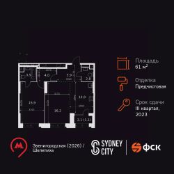Продаётся 2-к квартира номер 25 общей площадью 61.4 кв.м. на 4-м этаже 43 этажного здания. Отделка Whitebox. Цена с учётом скидки.