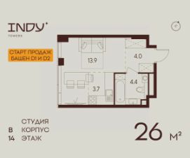 Продается просторная студия на 14 этаже жилого комплекса Indy Towers. Вид из окон: на улицу. Срок сдачи: 4 кв. 2026 г.