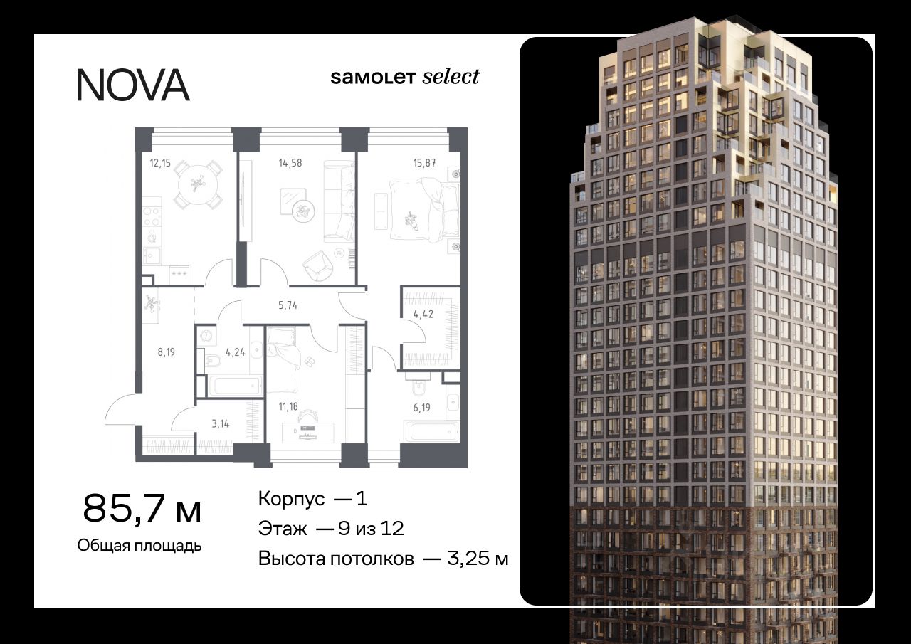 Строим кварталы для жизни с заботой о будущем. Предлагается 3-комнатная квартира премиум-класса 85,7 кв.м в корпусе 1 на 9 этаже, в ЖК "NOVA"