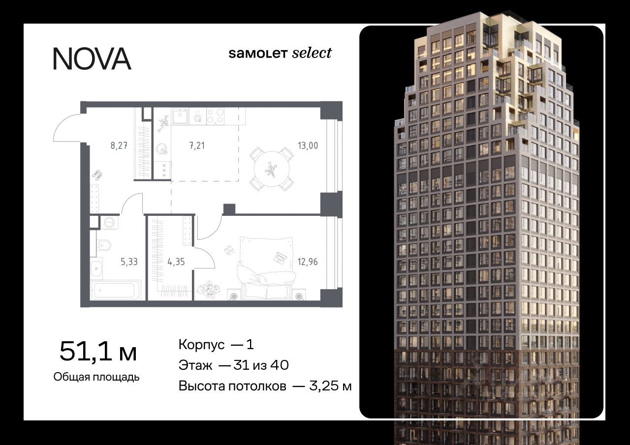 Строим кварталы для жизни с заботой о будущем. Предлагается 1-комнатная квартира премиум-класса 51,12 кв.м в корпусе 1 на 31 этаже, в ЖК "NOVA"