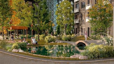 Чтобы отдохнуть от суеты города, достаточно выйти во двор: здесь раскинулся настоящий лес с живописными пейзажами. В тени деревьев жителей ждут пруд с мостиком и беседкой на берегу, тихие прогулочные аллеи, спортивная площадка и зоны для занятий йогой и бадминтоном на свежем воздухе.