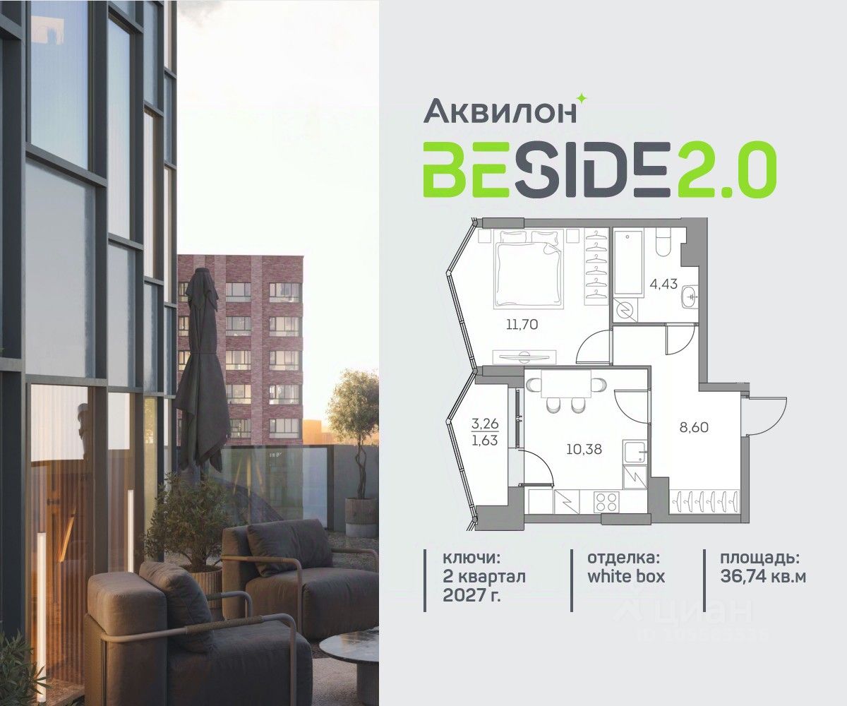 Продается уютная однокомнатная квартира на 14 этаже современного жилого комплекса Beside 2.0. Вид из окон: во двор и на улицу. Срок сдачи: 2 кв. 2027 г.